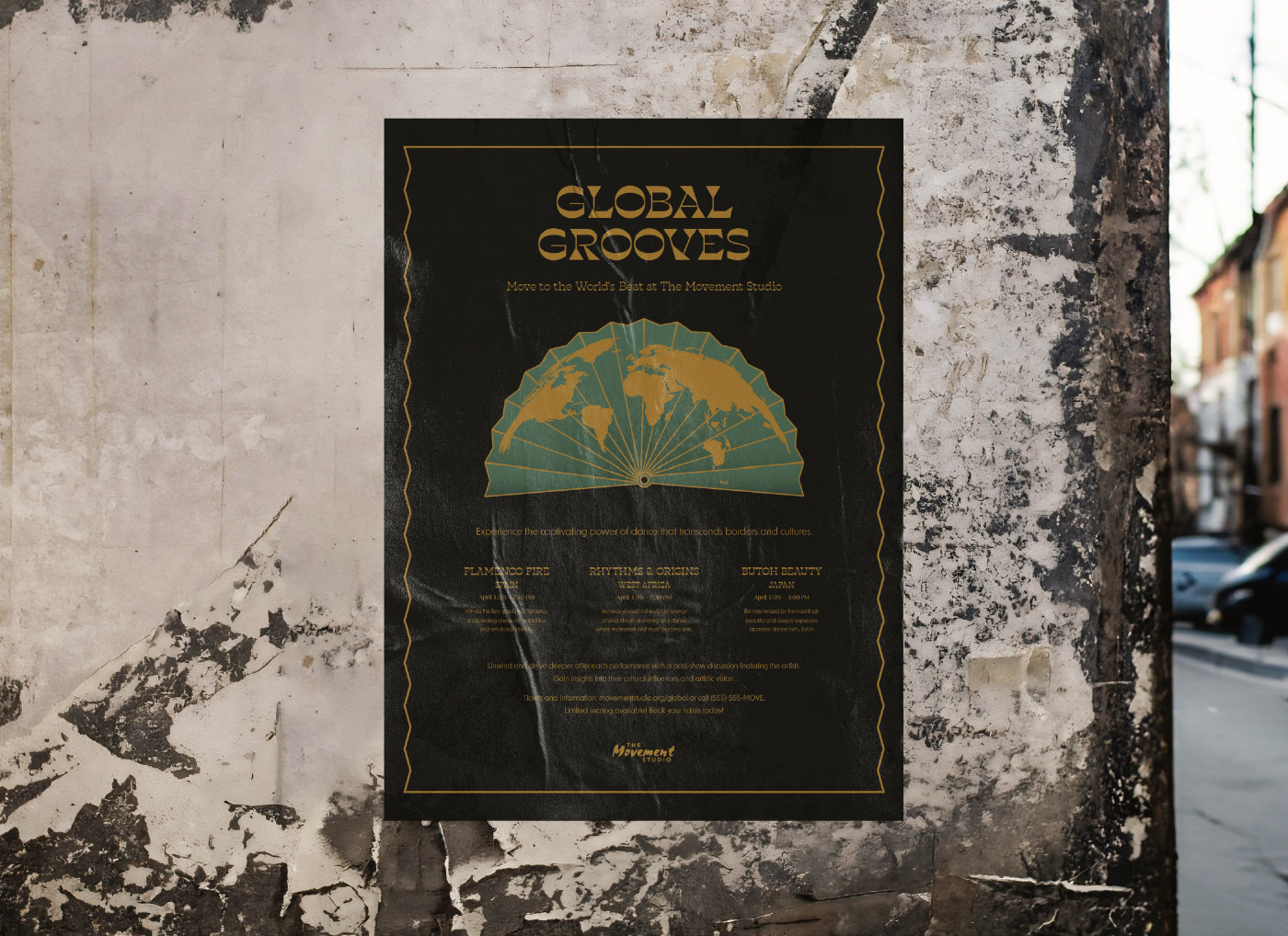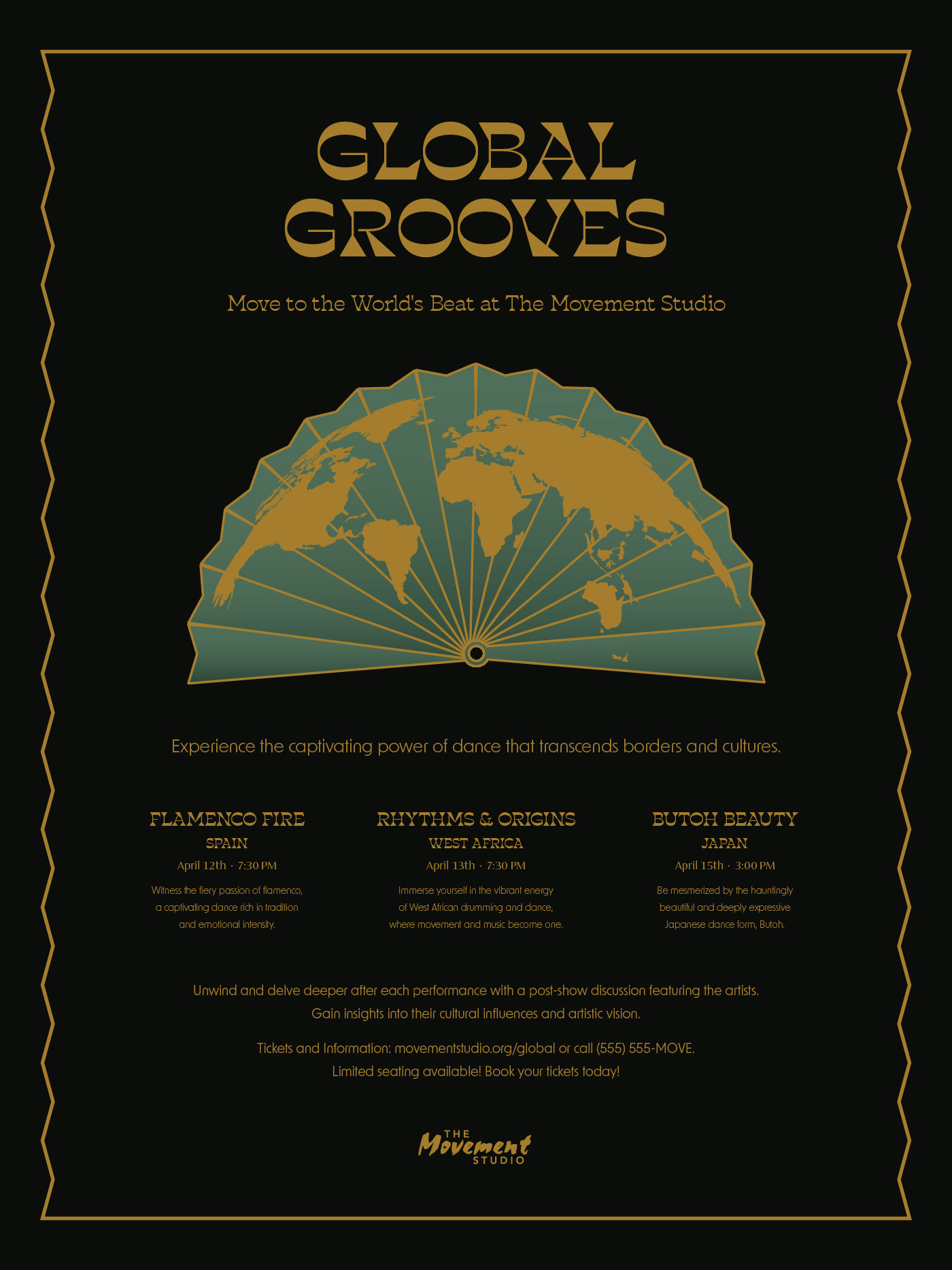 For a project in my Typography class in 2024, I designed a poster for a fictional event called Global Grooves. The event would showcase many different cultural dancers and musicians.